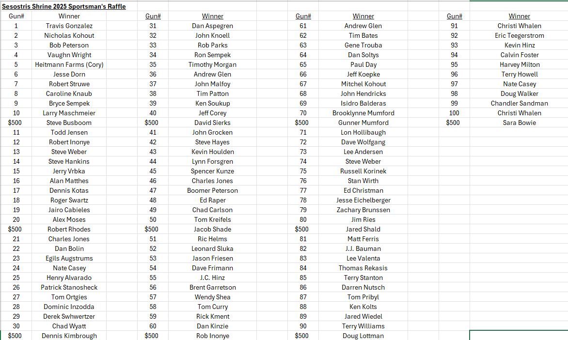 Please see below for the winners of the Sesostris Shrine 21st annual Sportsman's Raffle