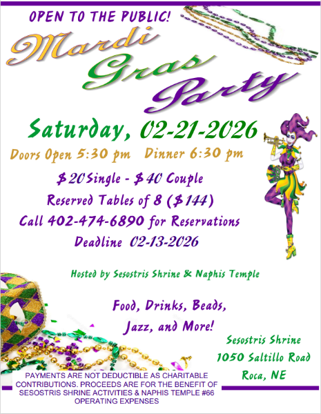 Cal Shrine Center Office (402) 474-6890 to make a reservation. Deadline 02-13-2026
